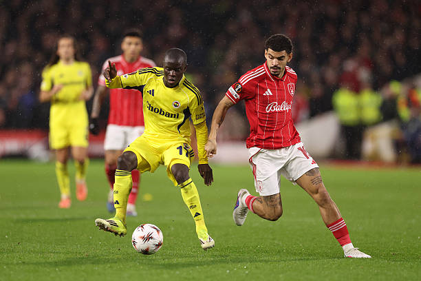 NOTTINGHAM, ENGLAND – FEBRUARY 26: N’Golo Kante of Fenerbahce and Morgan Gibbs-White of Nottingham Forest during the UEFA Europa League 2025/26 Knockout Play-off Second Leg match between Nottingham Forest FC and Fenerbahce SK at City Ground on February 26, 2026 in Nottingham, England. (Photo by Catherine Ivill – AMA/Getty Images)