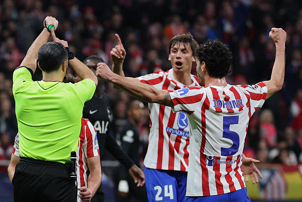 Dutch referee Serdar Gozubuyuk shows the writing ‘goal’ on his connected device after Atletico Madrid’s Spanish defender #24 Robin Le Normand (C) scored his team’s fourth during the UEFA Champions League last 16 first leg football match between Club Atletico de Madrid and Tottenham Hotspur at Metropolitano Stadium in Madrid on March 10, 2026. (Photo by Thomas COEX / AFP via Getty Images)