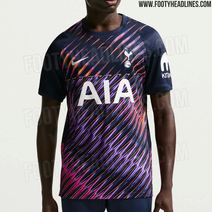 The leaked shirt marks a clear departure from the club’s usual understated away colours. Instead, it embraces a daring aesthetic, built on a deep navy base and highlighted by a vibrant, multi-coloured graphic across the front. A striking diagonal brushstroke effect blends electric pink, bright orange and light blue, while the club crest and sponsor logos stand out sharply in white for clarity.